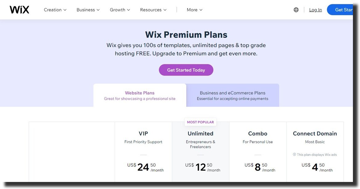 The unlimited plan is the most popular among the Wix premium plans. It is best for entrepreneurs and freelancers. You can compare the prices to select a paid plan for your business.